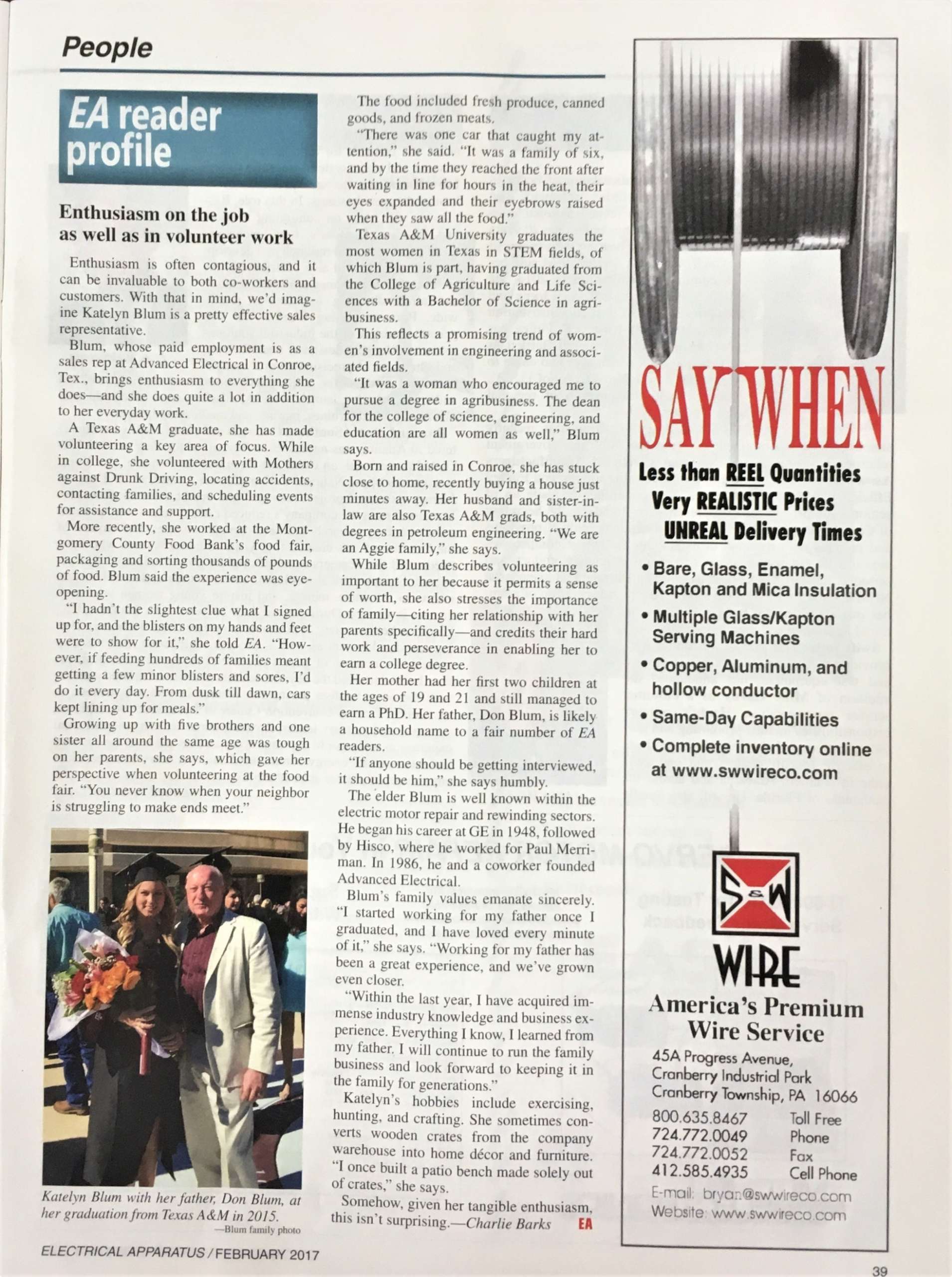 The VP of Advance Electrical, Katelyn Blum, was featured in the Electrical Apparatus Magazine February 2017. The article highlighted her background and charity work.